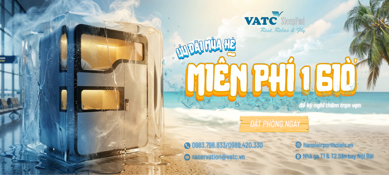 Phòng ngủ trong Sân bay Nội Bài là lựa chọn lý tưởng cho hành khách cần nghỉ ngơi tiện nghi ngay tại nhà ga. Nếu bạn đang tìm kiếm một giải pháp thoải mái tại Sân bay Nội Bài, đừng bỏ lỡ chương trình “1000 GIỜ NGHỈ MIỄN PHÍ" từ VATC SleepPod – Phòng ngủ tại Sân bay Nội Bài. Chỉ cần truy cập website, bạn đã có cơ hội nhận ưu đãi hấp dẫn và trải nghiệm phòng ngủ riêng tư, tiện nghi ngay tại Sân bay Nội Bài mà không cần di chuyển ra ngoài.